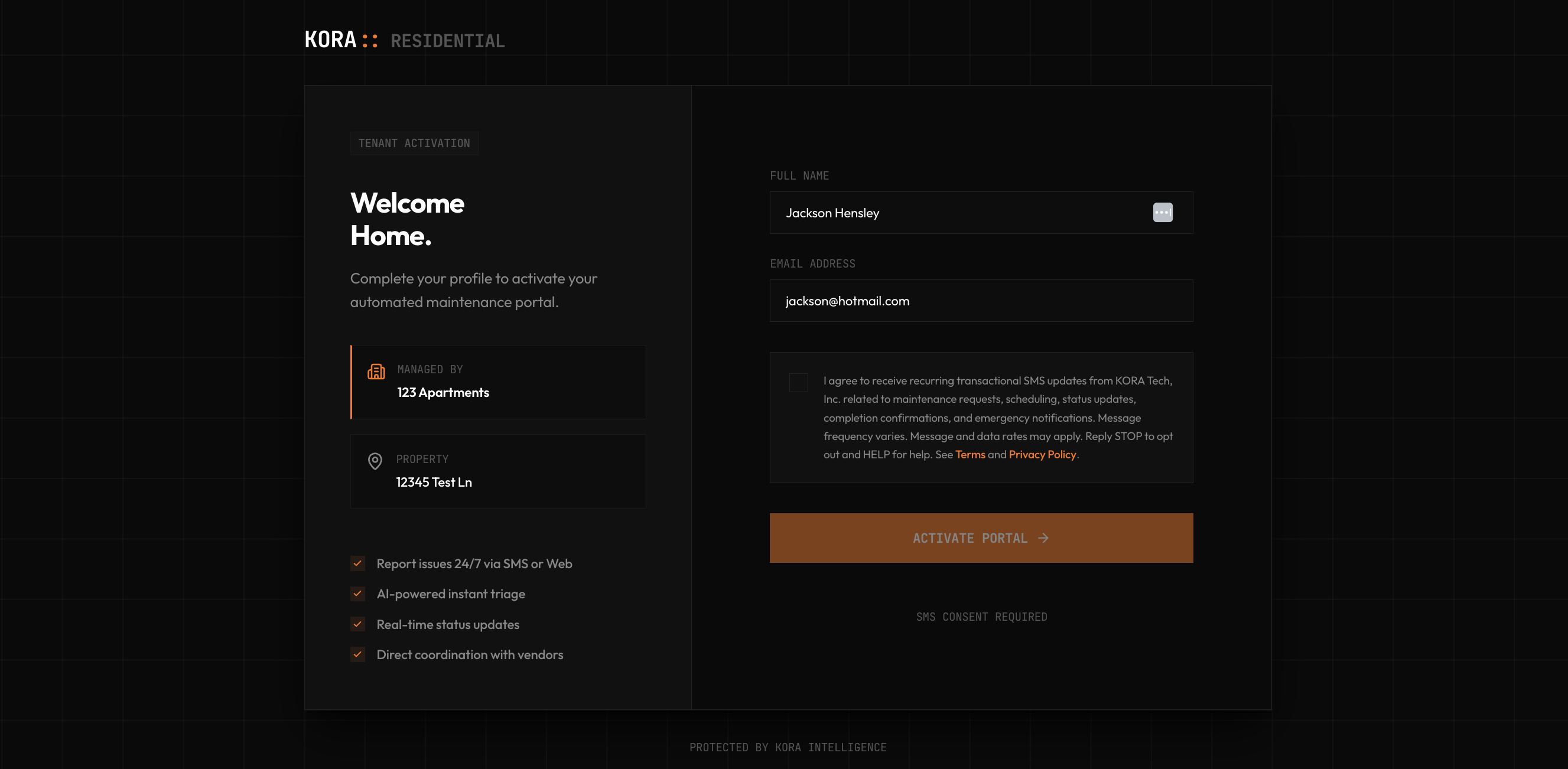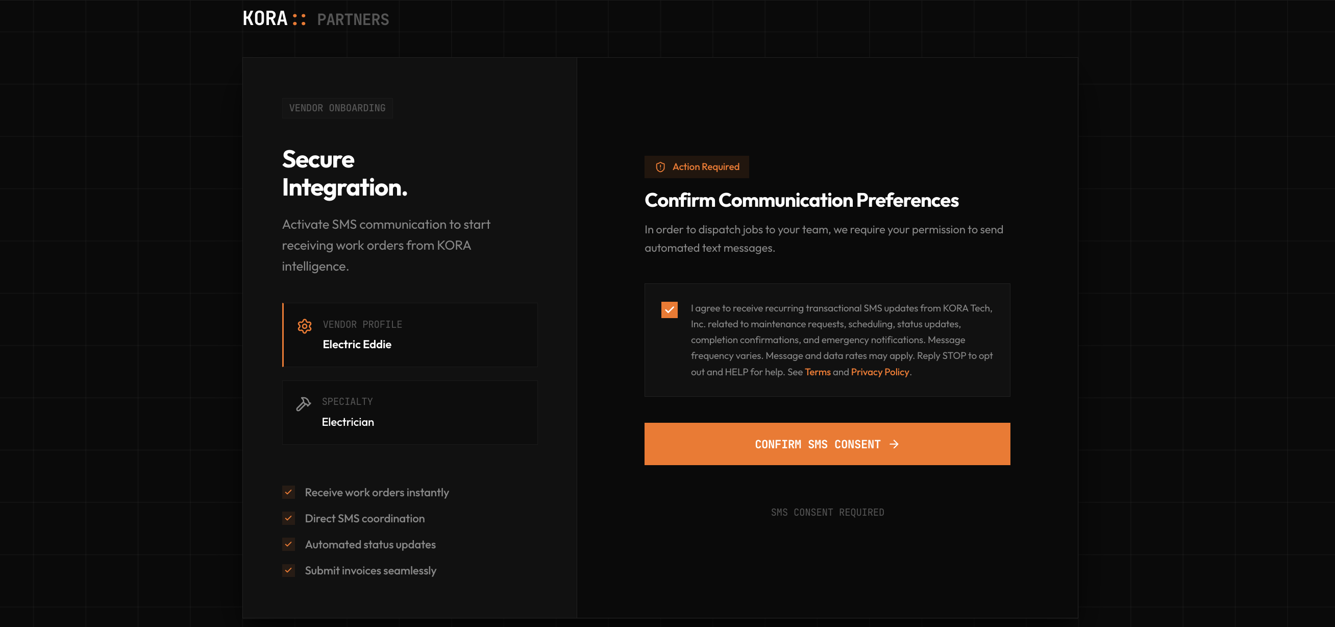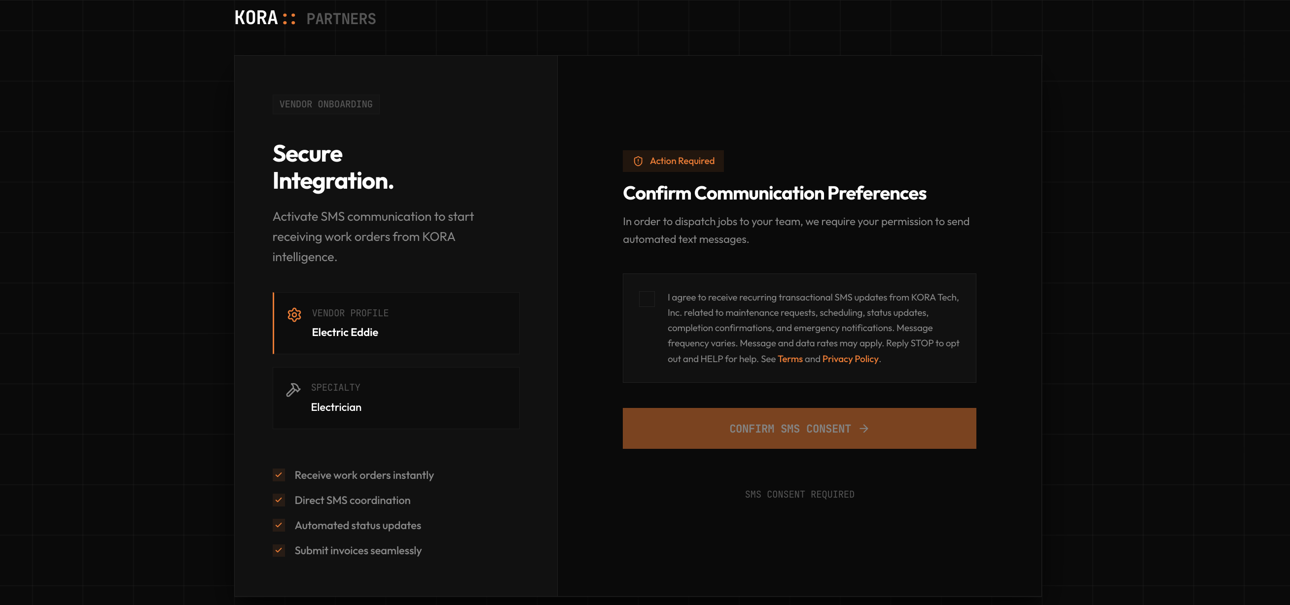 Exact consent language: I agree to receive recurring transactional SMS updates from KORA Tech, Inc. related to maintenance requests, scheduling, status updates, completion confirmations, and emergency notifications. Message frequency varies. Message and data rates may apply. Reply STOP to opt out and HELP for help. See Terms and Privacy Policy.