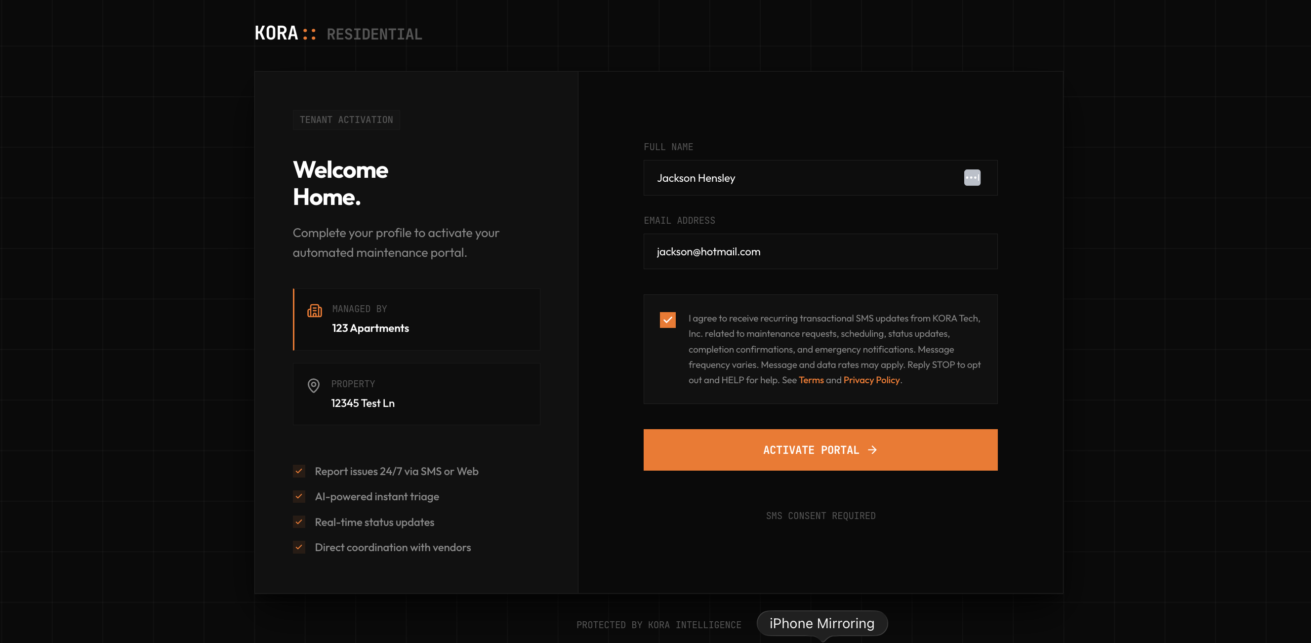 Program name: KORA Maintenance Alerts. By opting in to SMS workflows, you consent to receive recurring operational messages about maintenance requests, scheduling, status updates, completion, and emergency incidents.